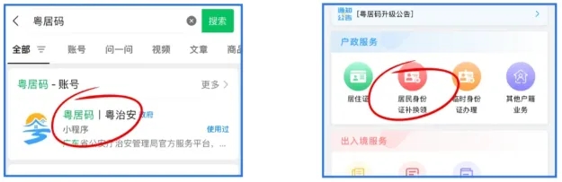1.打开粤居码|粤治安,点击居民身份证补换领;